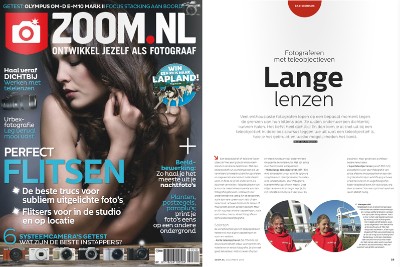 Teleobjectieven (21 november) In het najaar schreef InterAxxie maar liefst drie artikelen voor ZOOM. De eerste, een lang stuk over fotograferen met teleobjactieven van 8 pagina's - met zelf geschoten voorbeeldfoto's - werd in het decembernummer gepubliceerd. Het stuk belicht alle facetten van teleobjectieven. Van de beste technieken, de voor- en nadelen van zoomlenzen en en primes en de mogelijkheden van teleobjectieven. In november schreef InterAxxie bovendien nog twee andere ZOOM-artikelen. Eentje over fotograferen van sneeuw en ijs en eentje over minimalistisch fotograferen. Deze stukken worden gepubliceerd in 2016. ZOOM Magazine is te koop bij de boekhandel, supermarkt of de tijdschiftenkiosk óf digitaal voor op de telefoon of tablet. | |