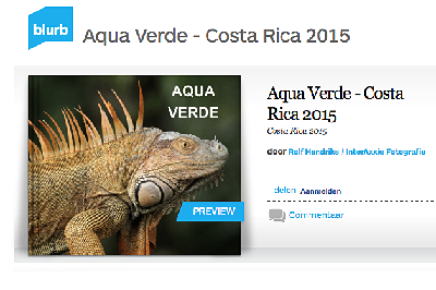 Nieuw boek (12 januari) Zeven jaar na de publicatie van 'Waarom altijd zo ver weg?' werd het wel weer eens tijd voor een nieuw InterAxxie-boek! En dat is er nu: 'Aqua Verde'! Het massieve, hardcover koffietafelboek weegt 2 kilo, telt 222 pagina's en meet 33 bij 24 cm. Het boek is een fotografische impressie van onze reis door Costa Rica. Aqua Verde is een testcase voor nog te publiceren InterAxxie-boeken en zal daarom niet actief verkocht worden. Het boek vormt - naast een prachtige gebundelde herinnering - de opmaat voor onder meer een nog dikker werk over 15 jaar Afrika-reizen, een portfolio van 12,5 jaar InterAxxie en een heel speciaal fotoboek over Floortje. Nieuwsgierig? Klik dan op onderstaande link voor een uitgebreide sneak preview! | |