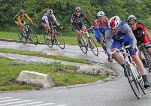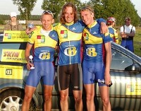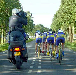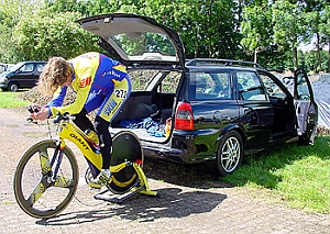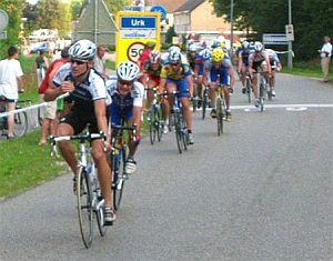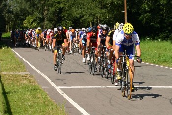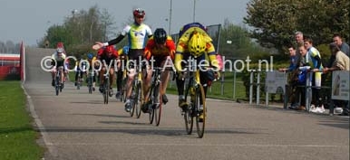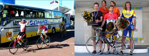 |  Podiumplek driedaagse van Sloten (Augustus 2005) Na een maand met een tamelijk serieuze vormcrisis (kansloos afgestapt in de criteriums van Weesp en Schoonoord) had ik weinig vertrouwen in een goede afloop van de Driedaagse. Maar fietsen blijft een vreemde sport. De eerste dag kon ik me moeiteloos handhaven in het geweld en in de hectische sprint veel punten meepakken. De tweede dag verliep zelfs nog beter. Twee vluchters bleven in de finale weliswaar net uit de greep van het peloton, maar ik bleek een supersprint in de benen te hebben en wist van kop af, met tegenwind het hele pak op twee lengtes te rijden. Ook de derde dag ging het lange tijd voortvarend, maar na dik een uur koers liepen de benen vol van het vele controleren en gaten dichtrijden. In de sprint zat ik op het oog goed gepositioneerd, maar werd ik er in extremis toch nog uitgekwakt. De laatste punten volstonden echter voor een derde plek in het eindklassement. |  Clubkampioen 2005 (30 juni 2005) In het verleden wilde het maar niet altijd lukken om clubkampioen te worden bij de amateurs A. De laatste jaren zat het echter keer op keer mee. Het kampioenschap van 2005 was er zelfs een met een gouden randje. Naast de eindsprint van een viermans kopgroep won ik namelijk ook alle drie de bonificatiesprints. Aangezien ik ook voor de wsv Emmen rijd, was het nog wel even zoeken naar het juiste tenu voor de foto. Gelukkig was Cor Bitter bereid om zijn jack even af te staan voor de huldiging. Inderdaad: Cor is die man die op de achtergrond demonstratief in ''n hemd staat met de armen over elkaar. Je zult maar clubsponsor zijn en dat zootje ongeregeld in het juiste jasje op de foto moeten krijgen. |  Podiumoverpeinzingen (22 juni 2005) Moet je blij zijn met een derde plek op een Nederlands Kampioenschap, of mag je ook een beetje balen dat er twee rapper waren dan jij? Feit is wel dat ik me niet hoef te schamen voor m'n optreden op het Nederlands Kampioenschap voor journalisten dat op woensdag 22 juni werd verreden op de boulevard van Noordwijk. Het was bloedheet, ik had de gewonnen koers van de avond daarvoor nog in de benen en het parcours had werkelijk alles wat ik haat: klinkers, vals plat, een finishstuk van slechts 80 meter en twee keerpunten van 180 graden. Een regelrechte kermiskoers dus en dat bleek al snel. Zestig man ineens door een bocht van 180 graden proppen lukt niet en dus waren de valpartijen en uitvallers niet van de lucht. Ik zat het eerste half uur attent bij de eerste 5 geposteerd, zat mee in wat test-ontsnappingen en had gelukkig geen heel slechte benen. Na 25 kilometer ontstond er een kopgroep van zeven renners (waaronder maar liefst vijf (ex-)elitecoureurs) waaruit de winnaar moest komen. De finish was net zo chaotisch als de koers zelf. De jury vergat te bellen, waardoor ik te lang twijfelde voor de laatste bocht. Resultaat was dat het kleine sprintertje van maandblad Fiets, die nog geen meter kop had gedaan, zich langs het hek drong, mij bijna onderuit reed en met een paar meter voorspong de korte sprint aanging. Ik kon na die mislukte bocht nog net genoeg snelheid ontwikkelen om twee renners voor me in te halen en kort na de winnaar over de streep te rollen. |  Volgens het boekje (3 mei 2005) De finale van de Midden Nederland Competitie in Amersfoort is traditioneel een wedstrijd die me wel ligt. De twee voorgaande edities werd ik respectievelijk vierde en tweede op dit snelle parcours met z'n twee lastige bochten en sprint heuvelaf. Afgelopen zondag leek het er echter lange tijd op dat het een moeilijke koers zou worden. Tijdens de bonificatiesprint probeerde ik me te sparen voor de rest van de koers en dat was de reden dat ik (onnodig) werd geklopt op de streep. De koers zelf kon ik redelijk aan. Al zat ik regelmatig mee in de verkeerde ontsnapping en verspilde ik teveel energie om de echte slagen ongedaan te maken. De massasprint waarmee de koers eindigde was er echter een volgens het boekje. De collega's uit Utrecht dachten kans te maken en trokken de sprint wonderschoon voor hun rappe man. Ik zat echter op de 53-11 in z'n wiel, kon de nummer vier in het lint verleiden om te vroeg aan te gaan en kon het vervolgens moeiteloos afmaken met een dikke lengte voorsprong op het nog omvangrijke peloton. |  Geklopt op de meet (15 juli 2004) Donderdag 15 juli begon ik aan mijn seizoensafsluiting: drie dagen op rij koersen in Drenthe. De eerste dag stond het crterioum van Hoogeveen op de rol, de dagen erna de tweedaagse van Schoonoord en Borger. En omdat Hoogeveen de voormalige thuishaven is van Daniël meldden zich donderdagavond twee Flevo's voor de koers op de wielerbaan. Gesupporterd door de herstellende Jeroen van der Veer werd het een slagveld in een soort Drentse Cycloon. Het regende keihard, het waaide als een gek, het was 13 graden en het parcours in Hoogeveen leek wel een ijsbaan. Kortom: prima weer voor de Polderboys en al snel kon ik me erg goed mengen in de strijd. Ik reed één van de beste wedstrijden van het seizoen (zo niet dé beste). Alles lukte: gaten dichtrijden vanaf kop, mee in elke goede ontsnapping en prijs pakken in de premiesprints! Toch miste ik nog bijna de slag. Toen er halverwege koers zes man wegreden, zat ik bij te komen van een premiesprint. Met een ultieme jump wist ik als laatste aan te sluiten en uit de greep van het peloton te blijven. Daniël bleef hangen en werd uiteindelijk zevende in de poltonssprint. Hoewel ik niet de beste was van de kopgroep, reed ik de finale als een beginner en wachtte ik te lang met het aangaan van de sprint. De vijf meter die ik zo liet liggen braken me op. Ik legde het finishstuk als snelste af, maar kwam een meter te kort voor de zege. Van de vier man die hun wiel naast elkaar over de meet drukten was ik met een banddikte vierde. Balen! Vooral omdat de eveneens verregende koers in Schoonoord me na een kwartier inhaalrace veel te link werd en de koers in Borger zelfs niet eens startte vanwege de eerder genoemde cycloon! Over een afknapper gesproken